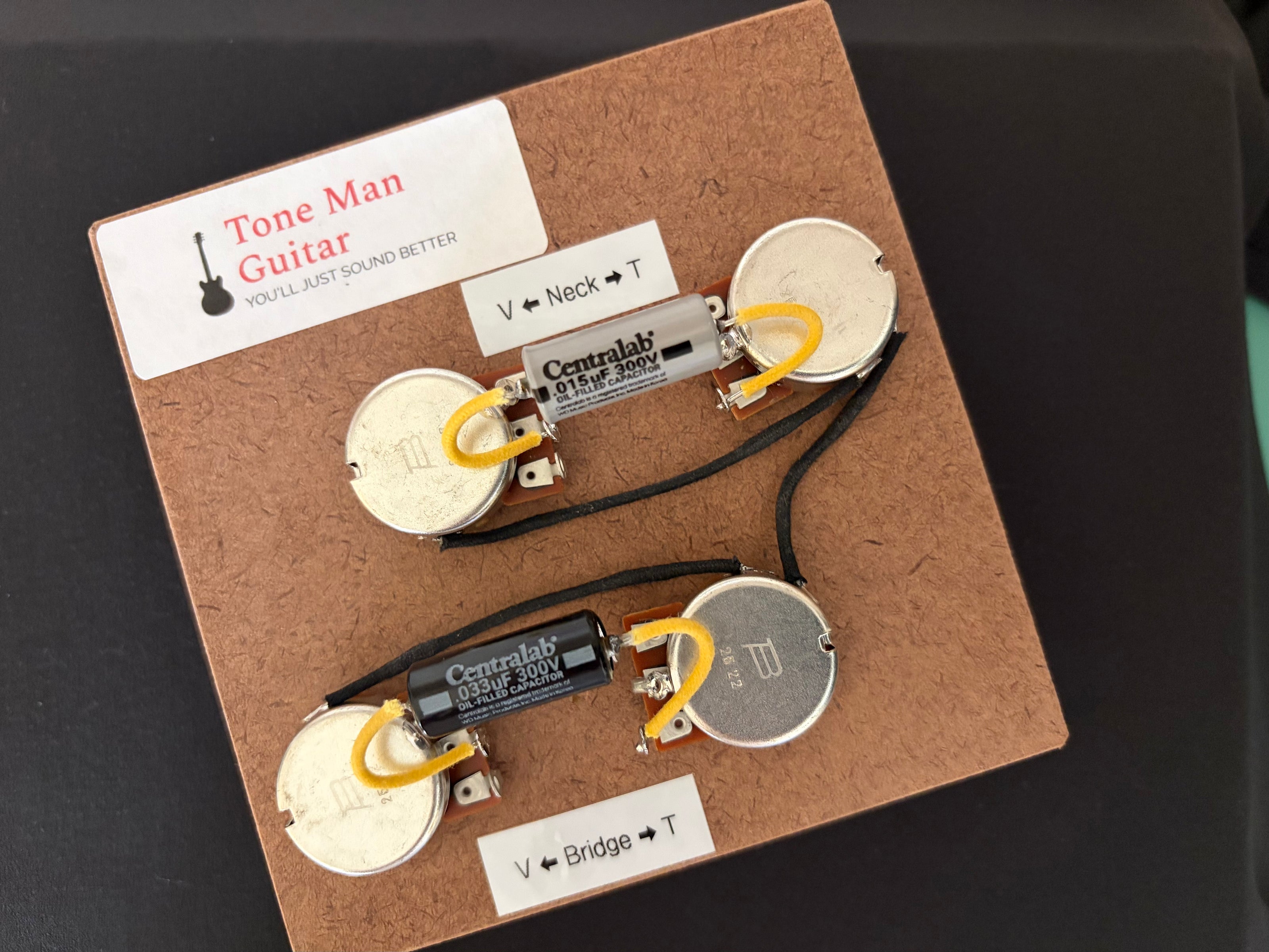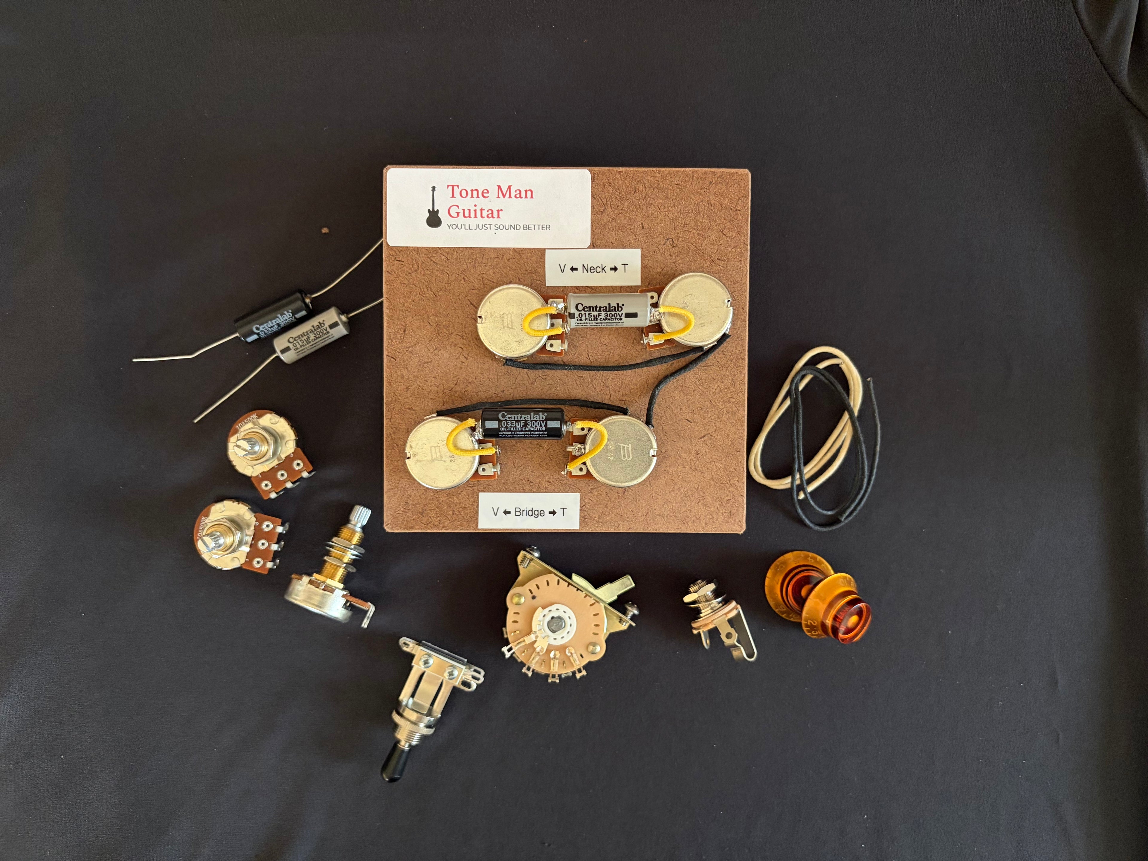Tone Man Guitar wiring harness kits are built using premium components trusted by guitar players who want dependable electronics and vintage tone. Ole school hand wired care built with pride. Kits come prewired on template board or DIY parts only.